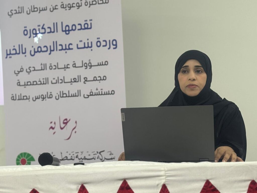 عقب ذلك قدّمت الدكتورة وردة بنت عبد الرحمن بالخير مسؤولة عيادة الثدي بمجمع العيادات التخصصية بمستشفى السلطان قابوس بصلالة كلمة أوضحت خلالها أهمية عربة الفحص والشروط الخاصة لفحص النساء كما تحدثت عن أهمية الغحص المبكر للمرأة الذي يساهم في نجاح العلاج بنسبة كبيرة وأشارت الدكتورة وردة إلى أن عربة الفحص المتنقلة تمثل حلًا عمليًا يسهم في إيصال الخدمة الصحية إلى مختلف شرائح المجتمع، لا سيما في المناطق البعيدة التي تفتقر إلى مرافق طبية متخصصة شاملة.