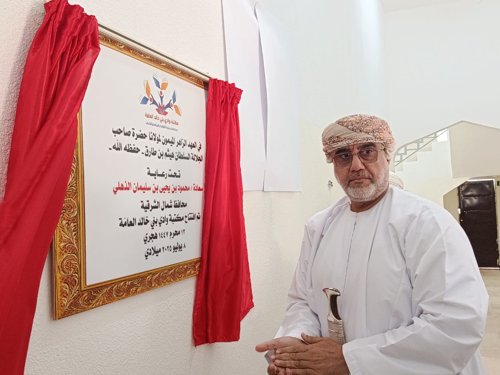 بعدها دشن سعادة محمود بن يحيى الذهلي محافظ شمال الشرقية مسابقة وادي بني خالد لحفظ القران الكريم وعلومه في نسحتها الأولى ثم قام سعادته بقص شريط الافتتاح وازاحة الستار عن اللوحة التذكارية ثم قام سعادنه والحضور بالتجول في أركان ومرافق مكتبة وادي بني خالد العامة .