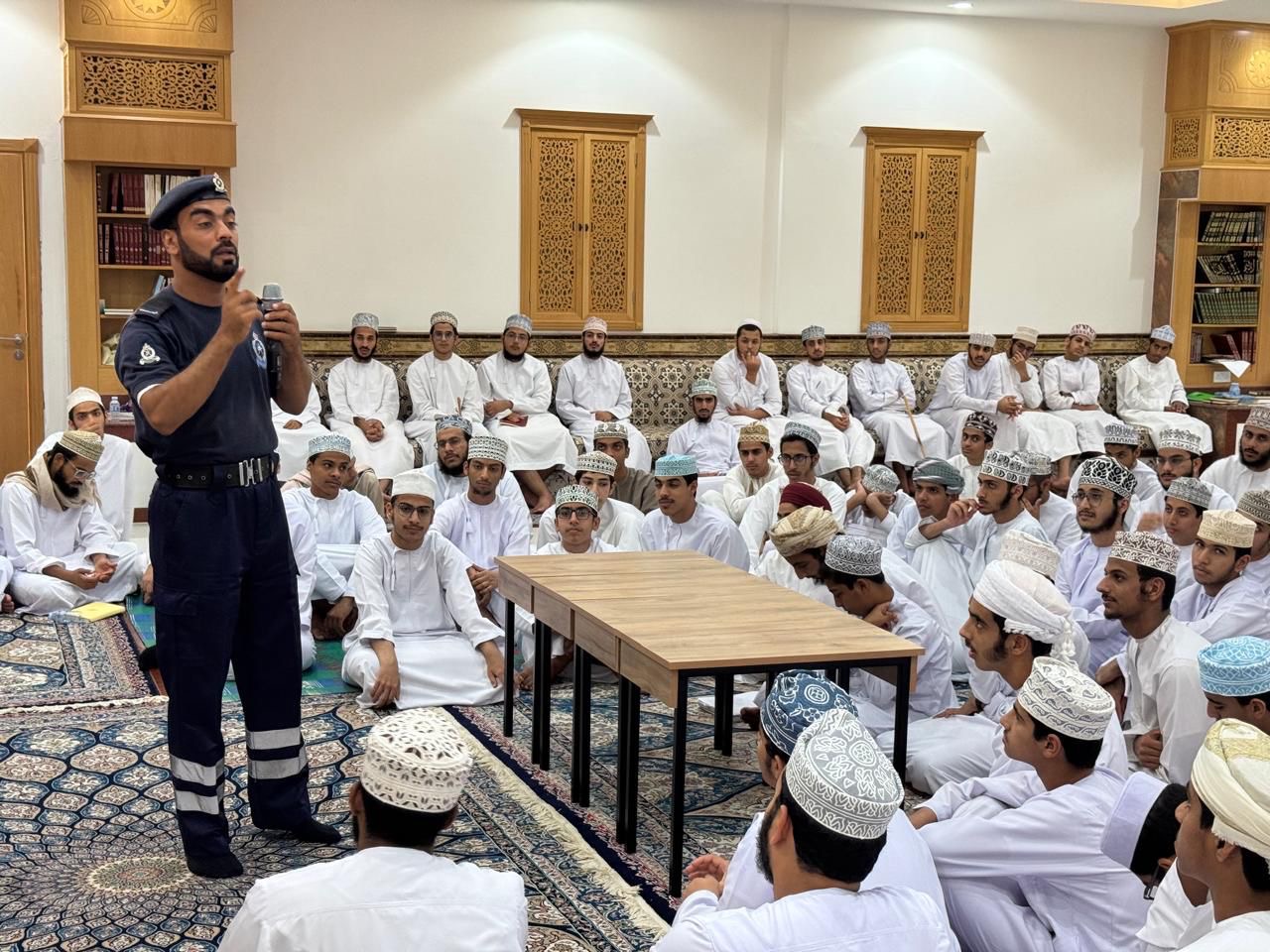 المحاضرة تضمنت عدد من المحاور منها عن مخاطر حرائق المنازل وتسريب الغاز وكيفية الوقاية منها والتعامل معها عند وقوع الخطر وكذالك عن الأسعافات الأولية وعن التعامل مع الاحداث الفجائية قدم المحاضرة كلاً من النقيب /إبراهيم الذخري والوكيل/ سليمان المفرجي والوكيل / يحيى القاسمي حيث كان هناك تدريبا عمليا لطلاب المركز حول تطبيق التعليمات التي قُدمت لهم .