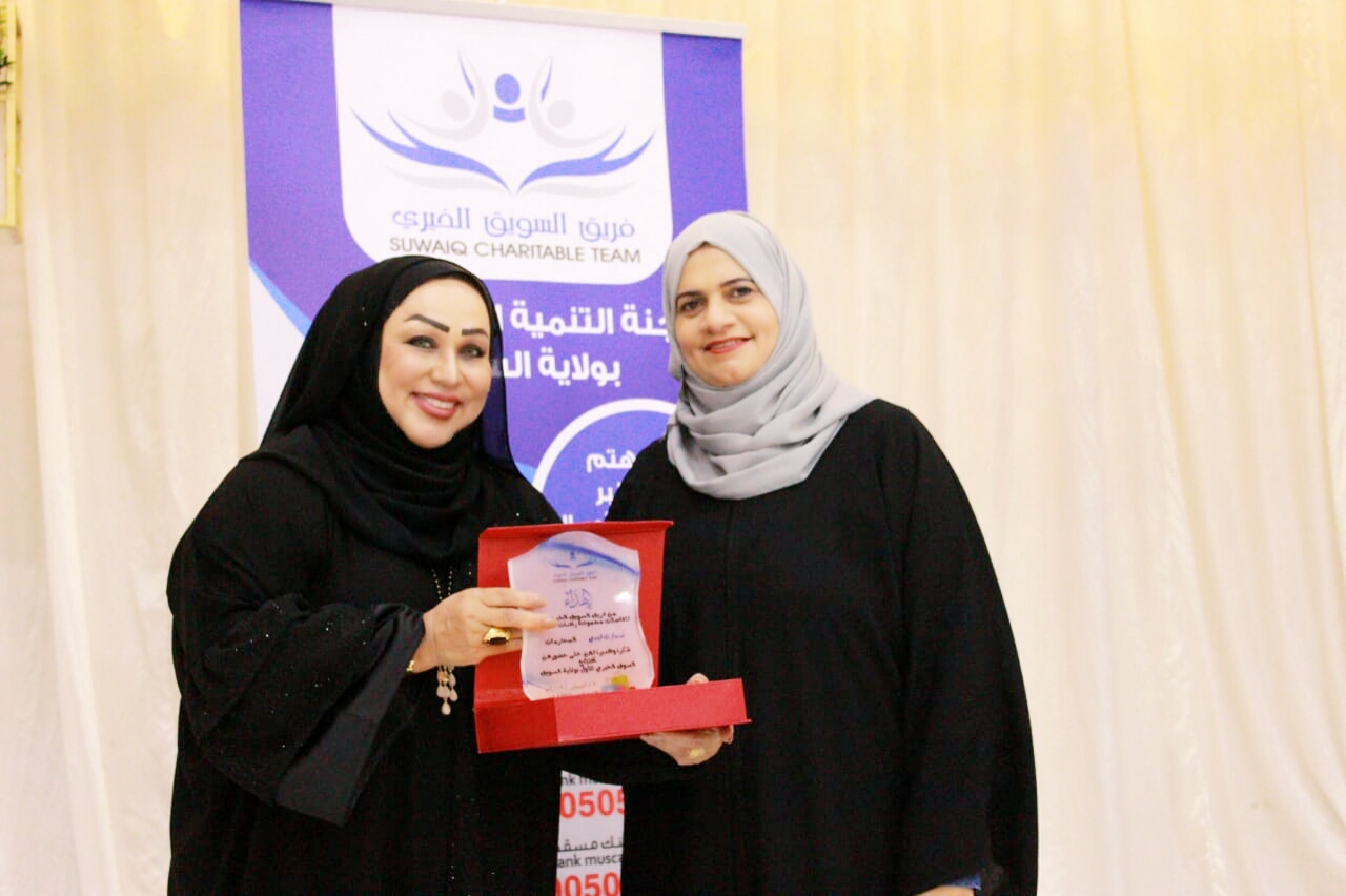 وفي ختام الحفل تم تكريم راعية المناسبة من قبل فريق السويق الخيري، شاكرين لها تلبية الدعوة راجين لها التألق والإبداع.