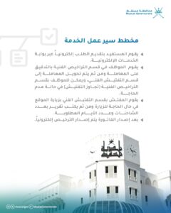 تتولى دائرة التراخيص الفنية – قسم التفتيش الفني ببلدية مسقط – مسؤولية الإشراف على تقديم الخدمة ومتابعة كافة الإجراءات المرتبطة بها. ويمكن للمستفيدين التقديم من خلال بوابة الخدمات الإلكترونية، أو عبر مكاتب سند، أو من خلال الموقع الإلكتروني لبلدية مسقط: www.mm.gov.om