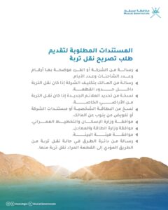 وتشترط الخدمة أيضًا على تقديم رسالة من إدارة الطرق في حال تم نقل التربة من الطريق المؤدي إلى القطعة المعنية، مع التأكيد على ضرورة تسوية الموقع بعد الانتهاء من العمل، حفاظًا على سلامة الموقع من التشويه.