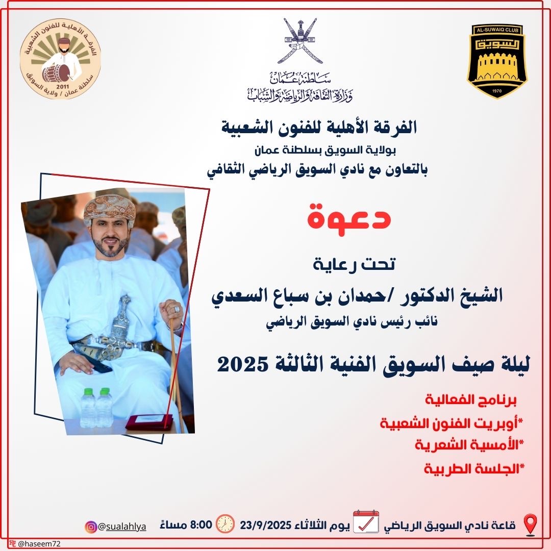 من هنا ستنطلق إقامة ليلة صيف السويق الفنية الثالثة بالتعاون مع نادي السويق الرياضي الثقافي يوم الثلاثاء الموافق ٢٠٢٥/٩/٢٣م تحت رعاية الشيخ الدكتور حمدان بن سباع السعدي نائب رئيس نادي السويق وعدد من الشخصيات المهتمة بالتراث والفنون في الولاية ستقام في قاعة نادي السويق الرياضي الثقافي.