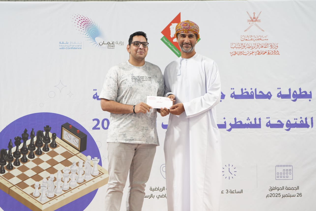 نظمت إدارة الثقافة والرياضة والشباب بمحافظة جنوب الباطنة مساء الأمس بالتعاون مع اللجنة العُمانية للشطرنج – بطولةَ محافظة جنوب الباطنة الدولية المفتوحة للشطرنج الخاطف 2025 المعتمدة من الاتحاد الدولي والمصنفة دوليا، بمشاركة / 158 /مشاركا ومشاركة من جنسيات مختلفة ، وذلك في المجمع الرياضي بولاية الرستاق.أقيمت البطولة وفق النظام السويسري من 9 جولات، منح كل لاعب 5 دقائق مع إضافة 3 ثواني بعد كل نقلة. وتأتي البطولة بهدف اكتشاف المواهب في مسابقات /الشطرنج الخاطف.