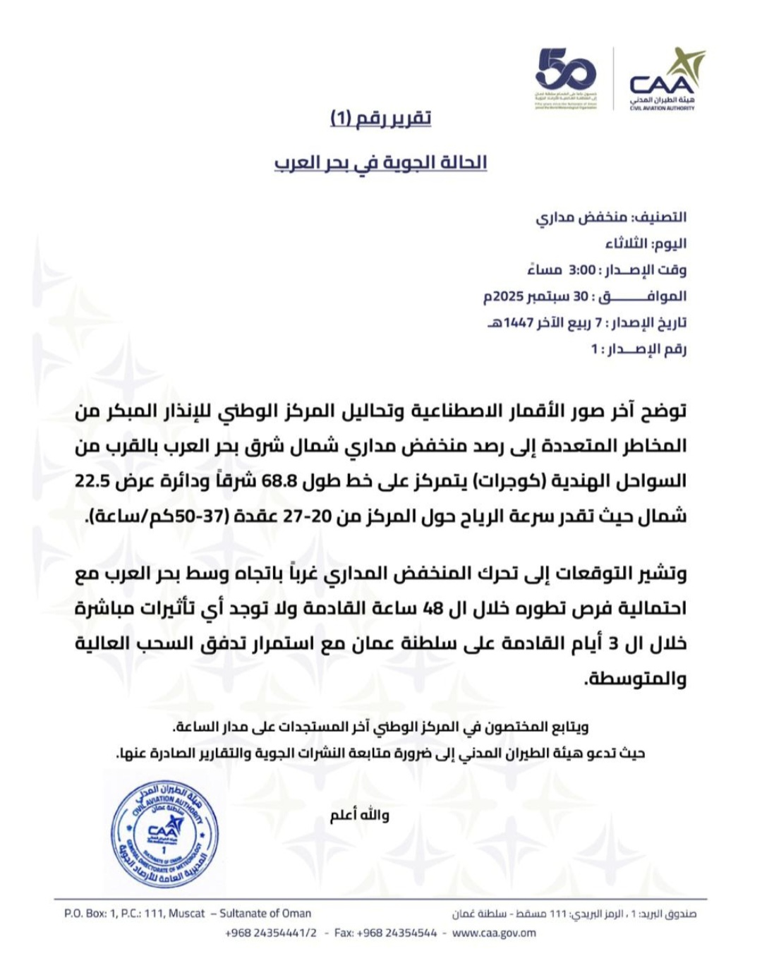 أصدرت هيئة الطيران المدني تقريرها الأول بشأن الحالة المدارية المتواجدة في بحر العرب .. قالت فيه : ـ
