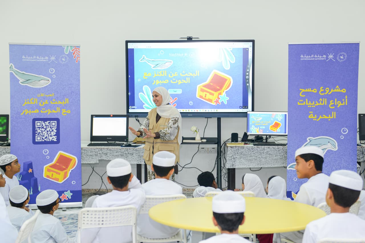 وفي أجواء من الحماس والتفاعل شارك الطلاب في لعبة “البحث عن الكنز مع الحوت صبور”، وهي لعبة تعليمية تفاعلية صممتها الهيئة بأسلوب يجمع بين المتعة والمعرفة، حيث يتعرف الطلاب من خلالها على أماكن وجود الثدييات البحرية والكنوز الطبيعية التي تزخر بها بيئة سلطنة عُمان.