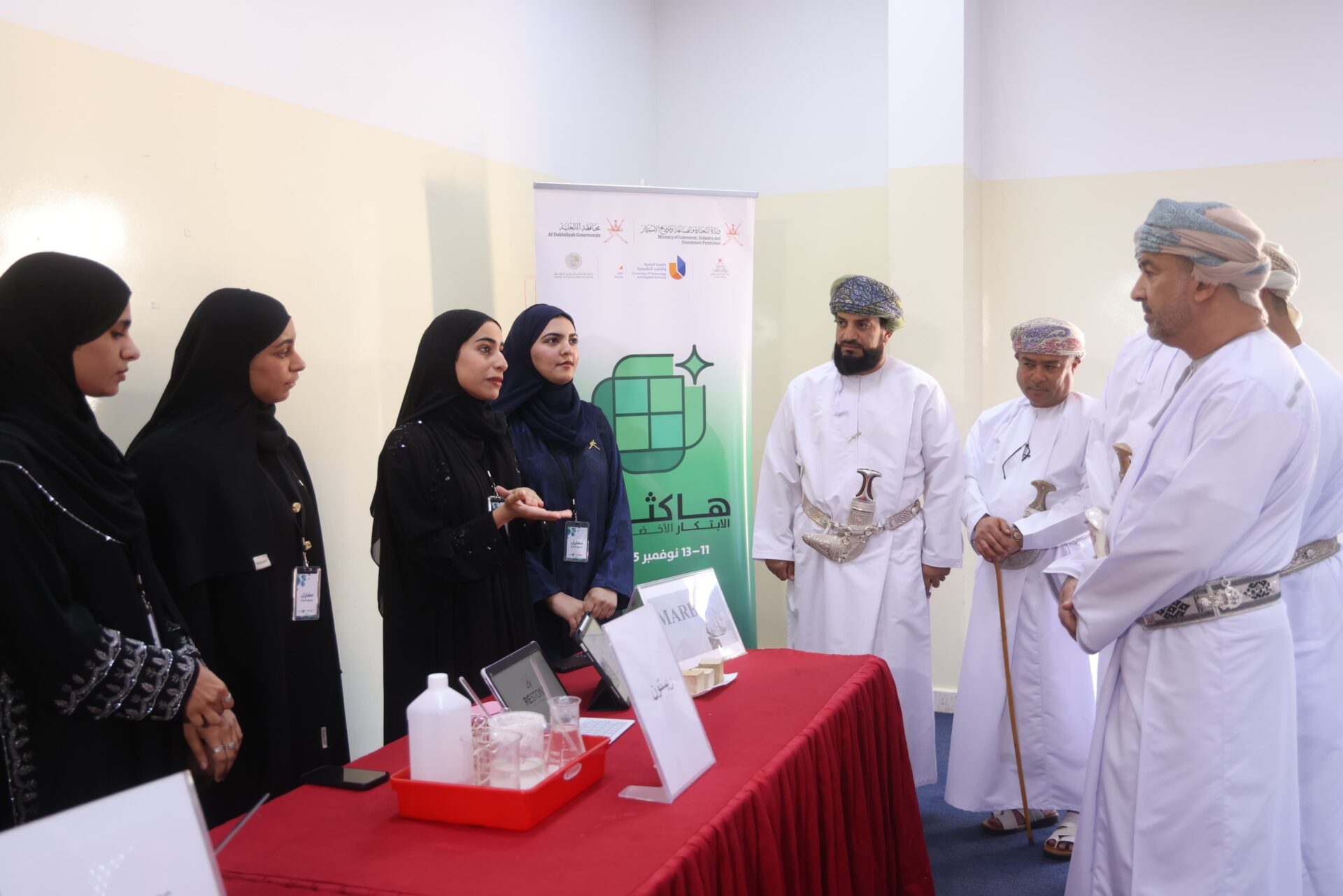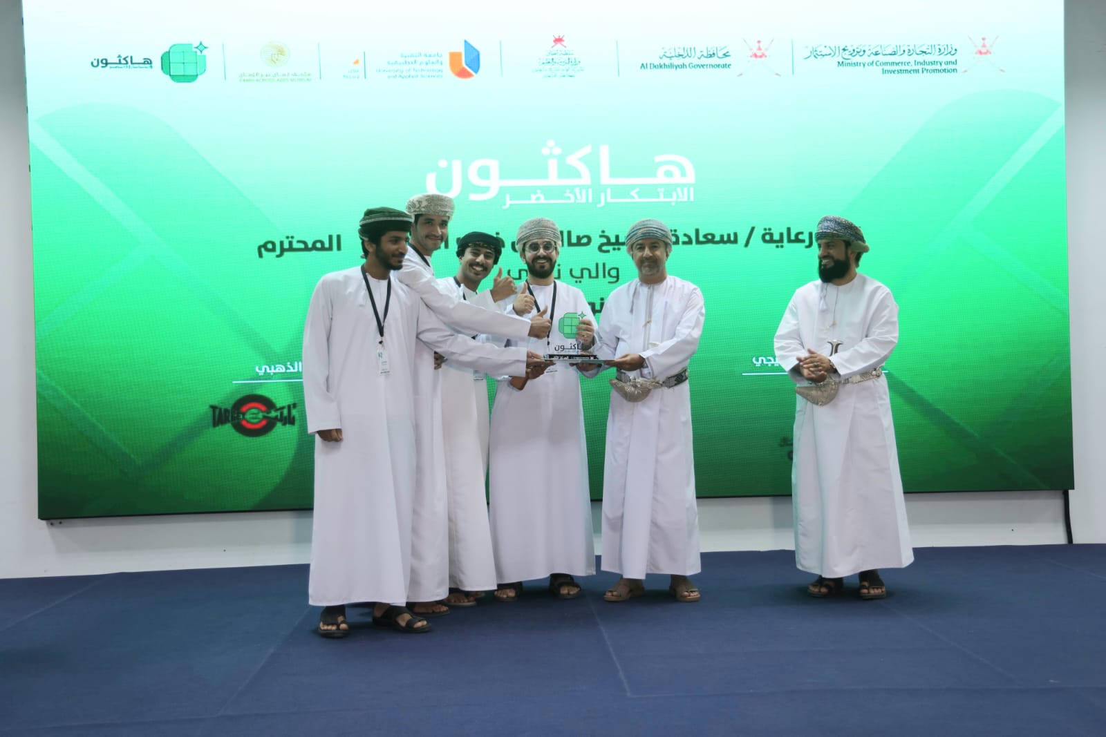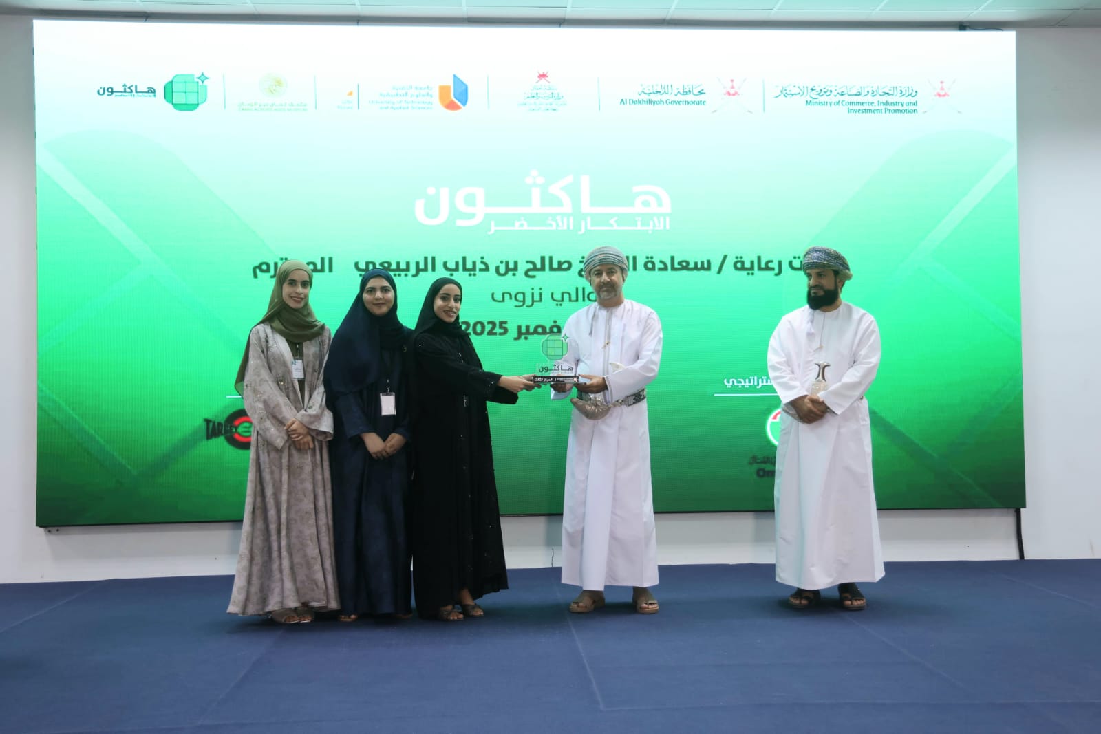 اختتمت إدارة التجارة والصناعة وترويج الاستثمار بمحافظة الداخلية اليوم الخميس الموافق 13 نوفمبر 2025م مسابقة هاكثون الابتكار الأخضر تحت رعاية سعادة الشيخ صالح بن ذياب الربيعي والي نزوى بحضور عدد من مسؤولي الجهات الحكومية والخاصة، وبمشاركة 37 طالب وطالبة من جامعة التقنية والعلوم التطبيقية وجامعة نزوى يمثلون ١٠ فرق، وذلك بمبنى جامعة التقنية والعلوم التطبيقية فرع نزوى.