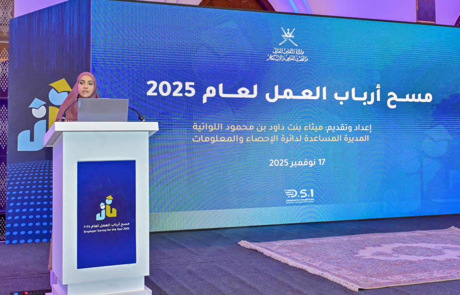 بعدها قدمت ميثاء بنت داود اللواتية المديرة المساعدة لدائرة الإحصاء والمعلومات بالوزارة عرضًا مرئيًا تطرقت فيه إلى نتائج مسح أرباب العمل لعام 2025، موضحةً منهجية العمل والمجتمع والعينة، وأهم المؤشرات المتعلقة بتوظيف مخرجات التعليم العالي في القطاع الخاص.