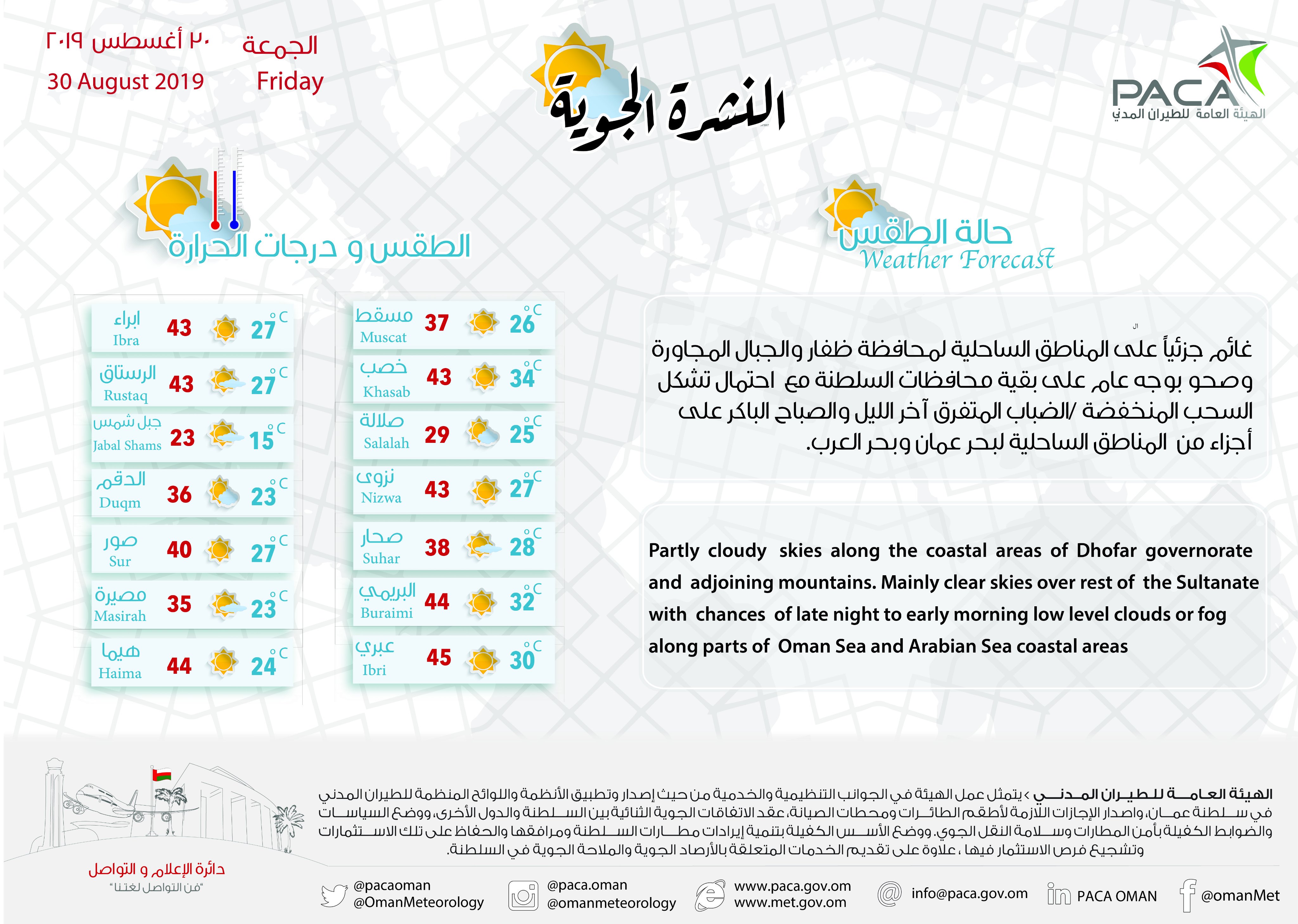 ‏ توضح الصورة الجوية تدفق السحب العالية والمتوسطة على الأجزاء الشمالية للسلطنة وانتشار السحب المنخفضة على على أجزاء من محافظات جنوب الشرقية والوسطى وظفار مع نشاط سحب الخريف على سواحل وجبال محافظة ظفار