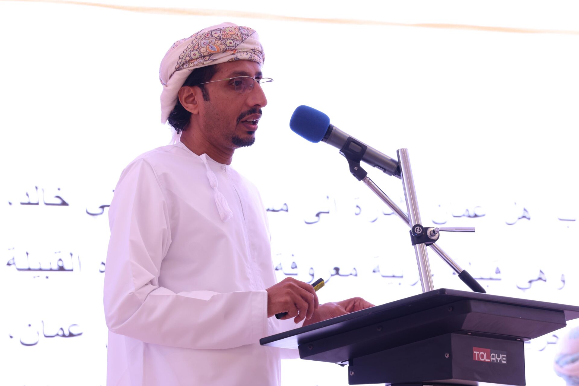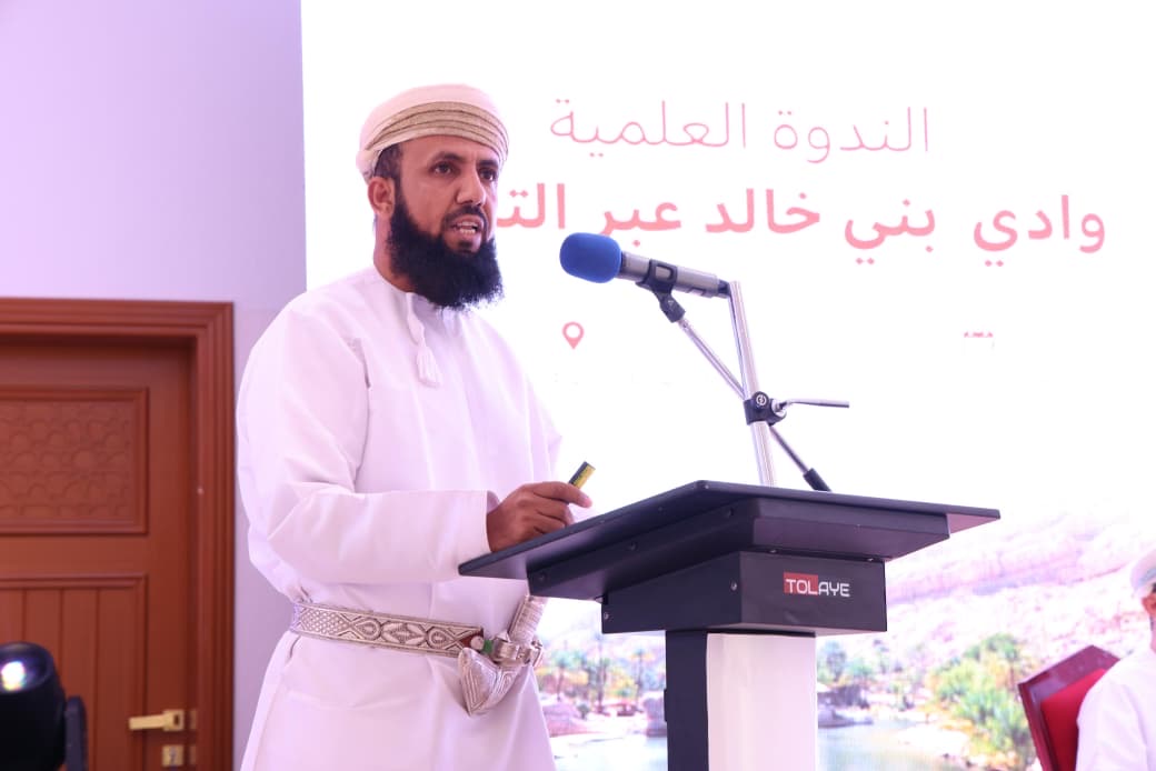 بعدها بدأت اوراق العمل البحثية في اليوم الأول حيث قدم الباحث فيصل بن احمد الراشدي ورقة عمل بعنوان الموقع الجغرافي وموارد المياه لولاية وادي بني خالد
