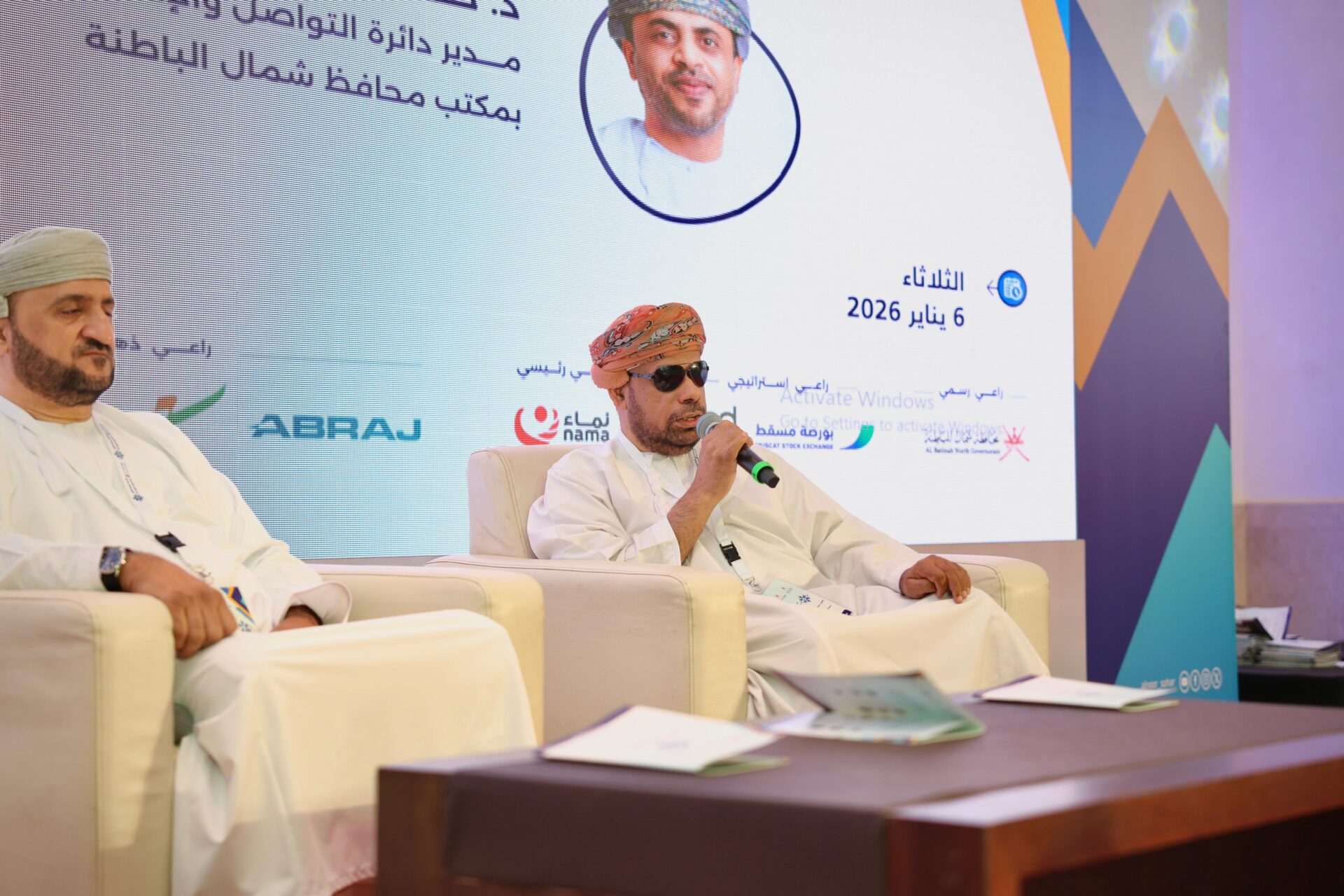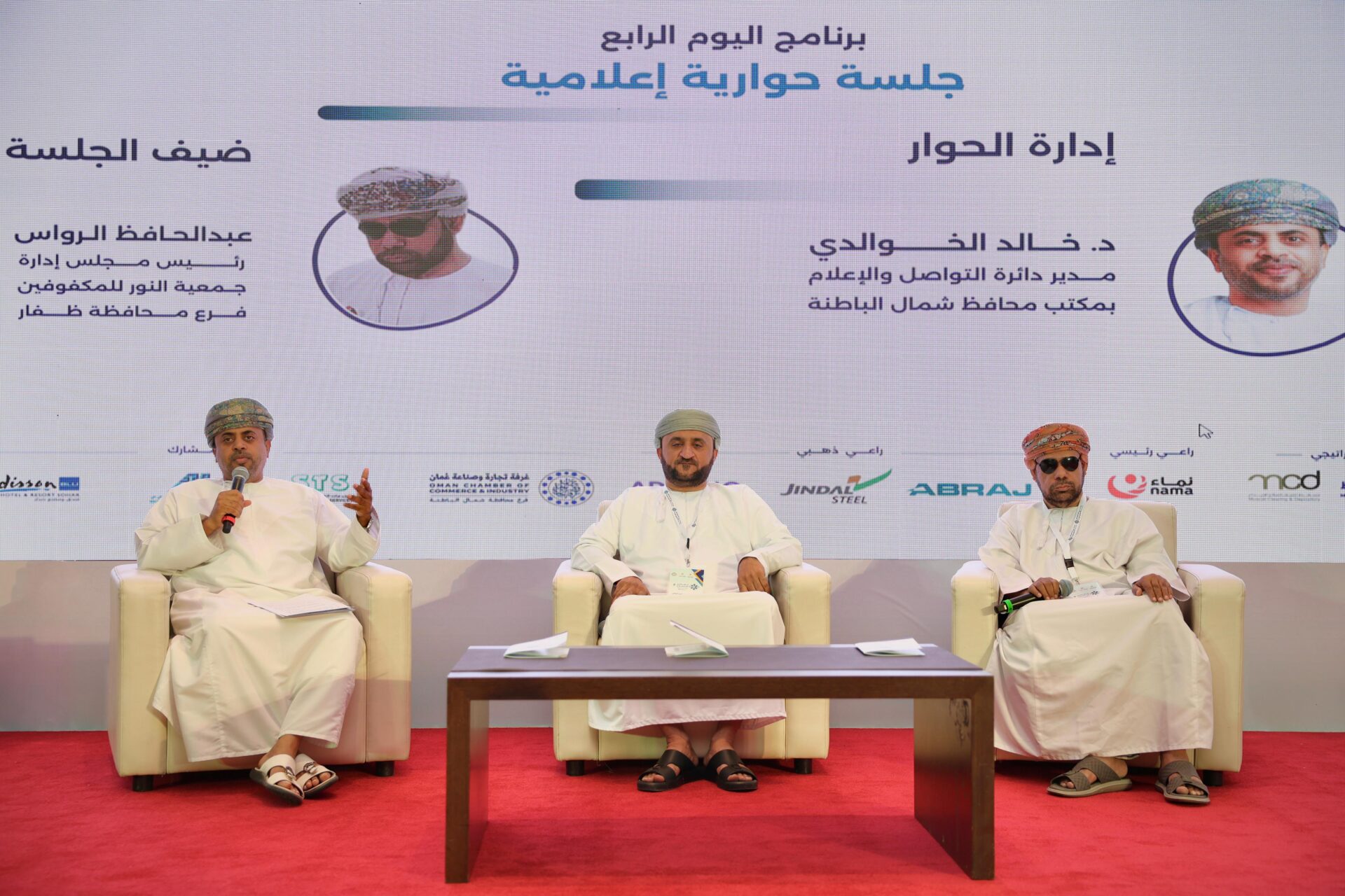 شارك في الجلسة الحوارية ثلاثة متحدثين وهم :عبد الحافظ الرواس رئيس مجلس إدارة جمعية النور للمكفوفين بمحافظة ظفار.