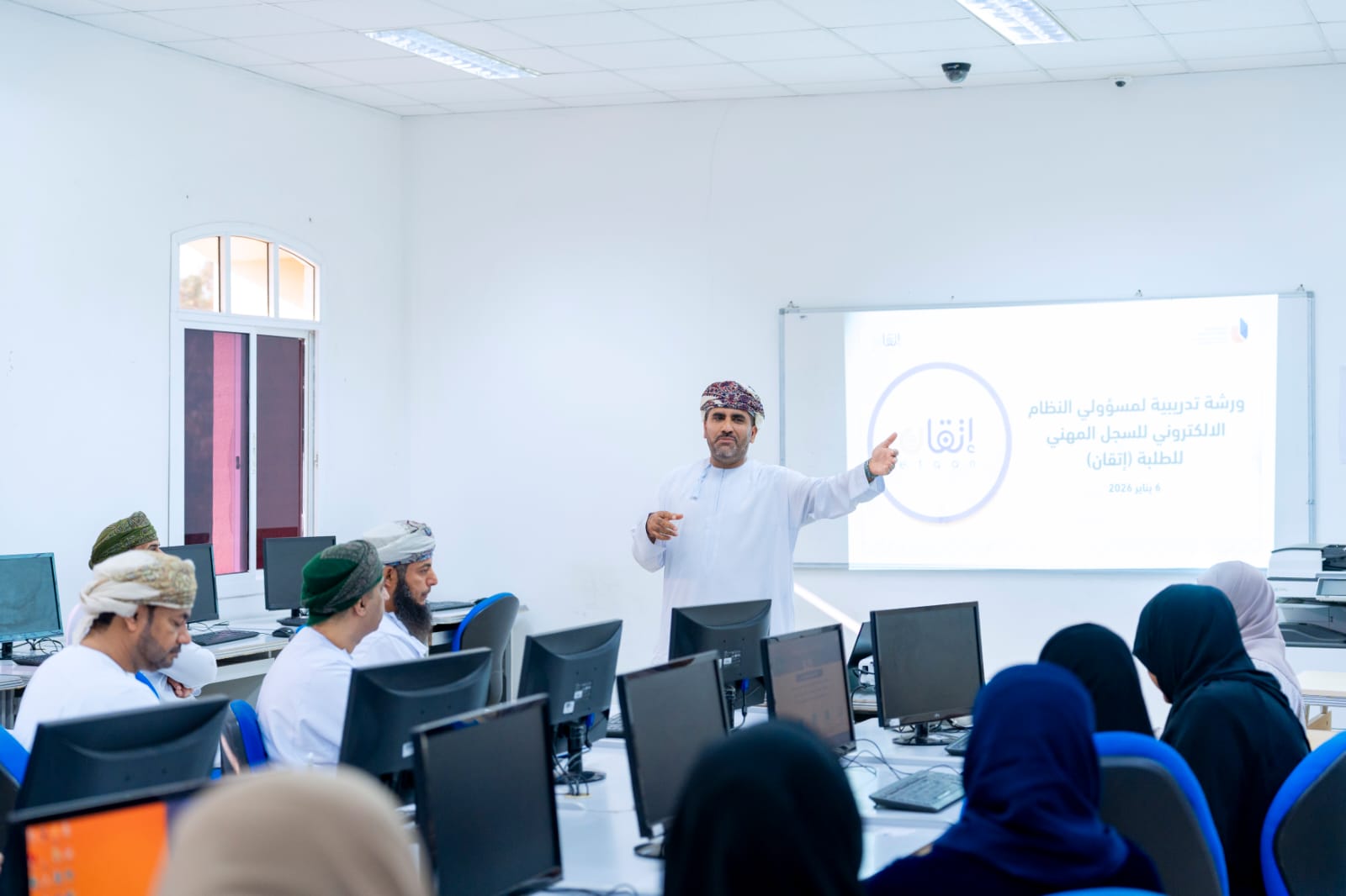 في إطار استكمال مراحل تفعيل السجل المهني للطلبة (إتقان)، الذي دشّنته جامعة التقنية والعلوم التطبيقية، نظّمت الجامعة ورشة تدريبية لمسؤولي النظام الإلكتروني للسجل المهني من مختلف فروع الجامعة، بهدف تعريفهم بصلاحيات وآلية استخدام النظام الإلكتروني للسجل وذلك يوم الثلاثاء 6 يناير 2026 بفرع الجامعة بمسقط.