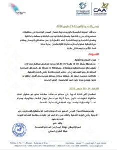 أصدرت هيئة الطيران المدني تقريرها الأول بشأن حالة الطقس المتوقعة خلال الفترة من ٢٠ إلى ٣٠ مارس الجاري عن الحالة الجوية.. حيث يعطي التقرير المرفق تفاصيل عن حالة الطقس المتوقعة لخمسة أيام القادمة مع التنبيهات المصاحبة.
