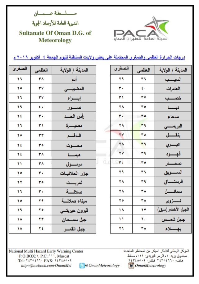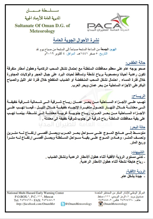 متابعينا الكرام إليكم فيما يلي نشرة الأحوال الجوية في محافظات السلطنة لهذا اليوم : الجمعة الخامس من صفر 1441هـ الموافق الرابع من أكتوبر 2019م – بإذن الله تعالى .