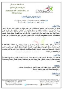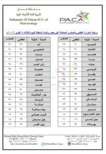 متابعينا الكرام إليكم فيما يلي نشرة الأحوال الجوية في محافظات السلطنة لهذا اليوم : الثلاثاء التاسع من صفر 1441هـ الموافق الثامن من أكتوبر 2019م – بإذن الله تعالى .