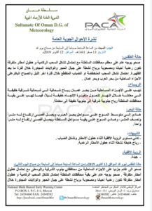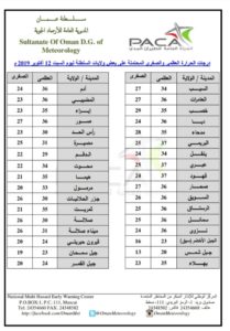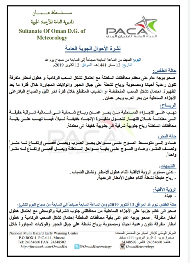 متابعينا الكرام إليكم فيما يلي نشرة الأحوال الجوية في محافظات السلطنة لهذا اليوم : السبت الثالث عشر من صفر 1441هـ الموافق الثاني عشر من أكتوبر 2019م – بإذن الله تعالى .