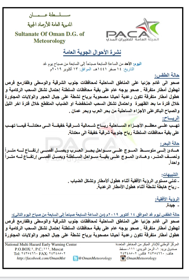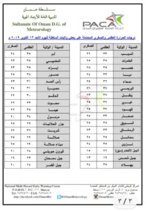 متابعينا الكرام إليكم فيما يلي نشرة الأحوال الجوية في محافظات السلطنة لهذا اليوم : الأحد الرابع عشر من صفر 1441هـ الموافق الثالث عشر من أكتوبر 2019م – بإذن الله تعالى .