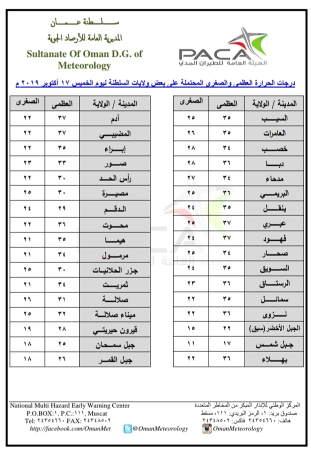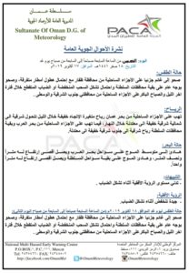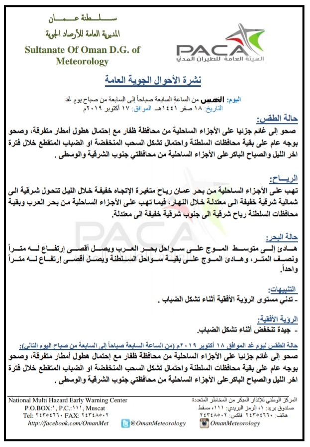 متابعينا الكرام إليكم فيما يلي نشرة الأحوال الجوية في محافظات السلطنة لهذا اليوم : الخميس الثامن عشر من صفر 1441هـ الموافق السابع عشر من أكتوبر 2019م – بإذن الله تعالى .