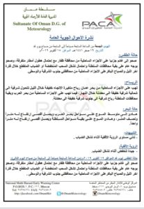 ▪︎ الرياح : تهب على الأجزاء الساحلية من بحر عمان رياح متغيرة الإتجاه خفيفة خلال الليل تتحول شرقية إلى شمالية شرقية خفيفة إلى معتدلة خلال النهار ، فيما تهب على الأجزاء الساحلية من بحر العرب وبقية محافظات السلطنة رياح شرقية إلى جنوب شرقية خفيفة الى معتدلة .
