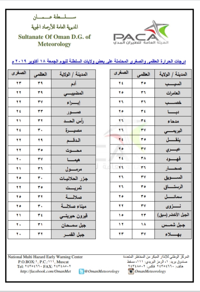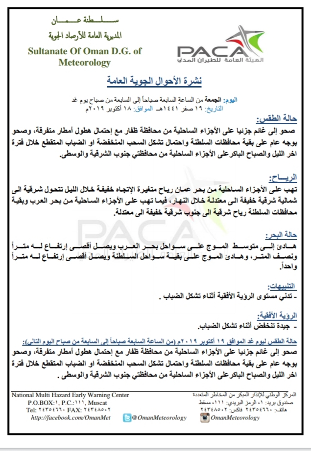 متابعينا الكرام إليكم فيما يلي نشرة الأحوال الجوية في محافظات السلطنة لهذا اليوم : الجمعه التاسع عشر من صفر 1441هـ الموافق الثامن عشر من أكتوبر 2019م – بإذن الله تعالى .