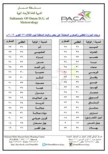 ▪︎ درجات الحرارة : من المتوقع أن تبلغ درجة الحرارة اليوم في مسقط بإذن الله – 33 العظمى ، والصغرى 24 – فيما تبلغ في صلالة : العظمى 34 والصغرى 25 ، وتصل أعلى درجات الحرارة فوق منتصف الثلاثينيات في أغلب المحافاظات الشمالية للسلطنة ، في حين تصل أدنى درجات الحرارة 9 درجات مئوية في جبل شمس إن شاء الله تعالى .