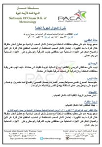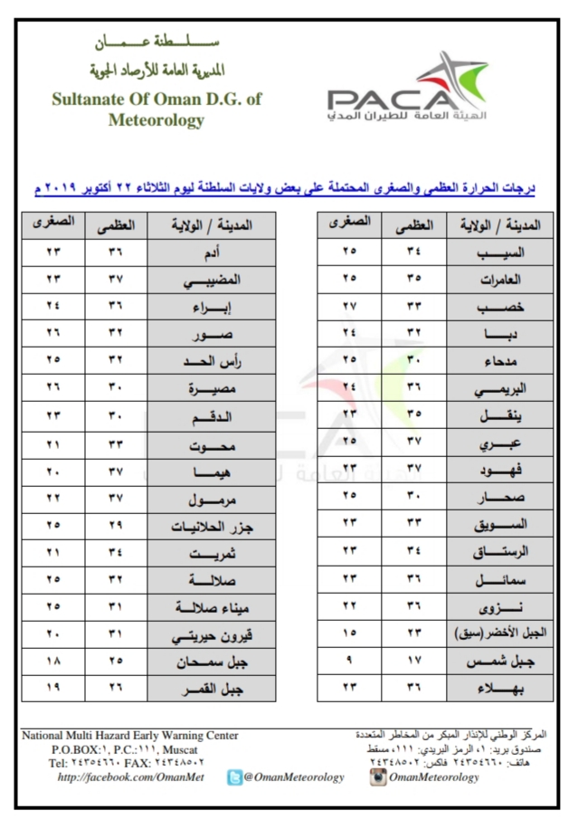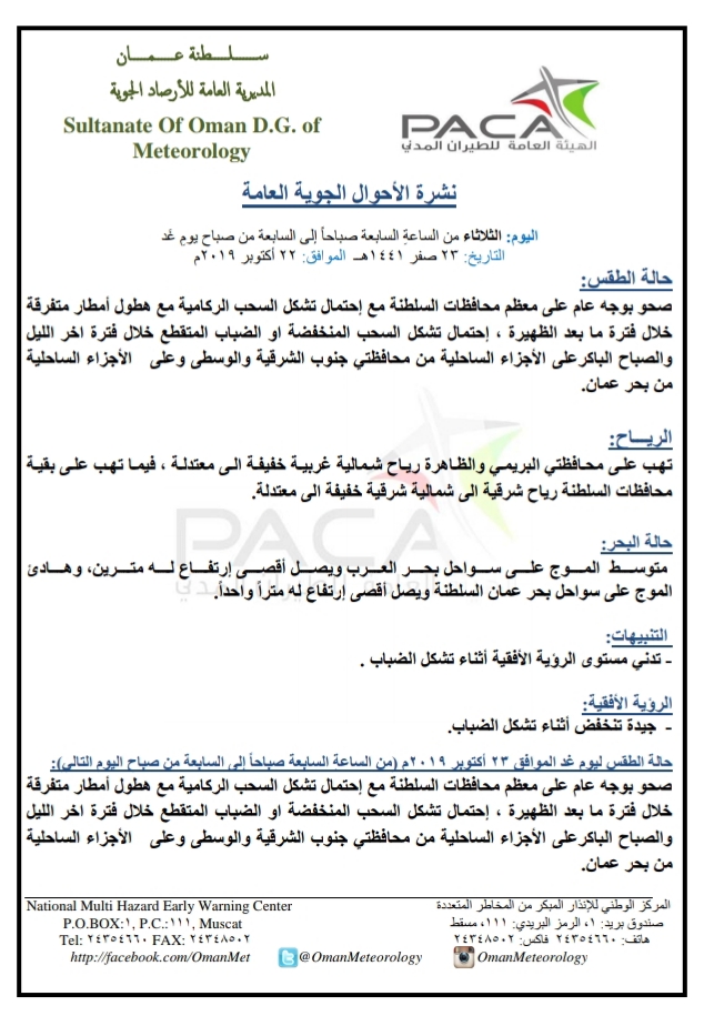 متابعينا الكرام إليكم فيما يلي نشرة الأحوال الجوية في محافظات السلطنة لهذا اليوم : الثلاثاء الثالث والعشرين من صفر 1441هـ الموافق الثاني والعشرين من أكتوبر 2019م – بإذن الله تعالى .