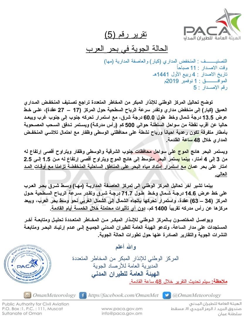 توضح تحاليل المركز الوطني للإنذار المبكر من المخاطر المتعددة تراجع تصنيف المنخفض المداري العميق ( كيار ) إلى منخفض مداري وتقدر سرعة الرياح السطحية حول المركز ( 17 – 27 عقدة ) ، على خط عرض 13 . 5 درجة شمال وخط طول 0 . 60 درجة شرق ، مع استمرار تحركه جنوب إلى جنوب غرب ويبعد حاليا عن أقرب نقطة من سواحل السلطنة حوالي 500 كم ( رأس مدركة ) ويستمر تدفق السحب المصحوبة بأمطار متفرقة تكون رعدية أحياناً ورياح نشطة على محافظتي الوسطى وظفار مع احتمال تلاشي المنخفض المداري خلال 48 ساعة القادمة ويستمر البحر هائج الموج على سواحل محافظات جنوب الشرقية والوسطى وظفار ويتراوح أقصى إرتفاع له من 3 إلى 4 أمتار ، بينما يستمر البحر متوسط إلى هانج الموج ويتراوح أقصى إرتفاع له من 1 . 5 إلى 2 . 5 امتار على بحر عمان مع استمرار إمتداد مياه البحر على المناطق الساحلية المنخفضة تزامنا مع أوقات المد العالي .
