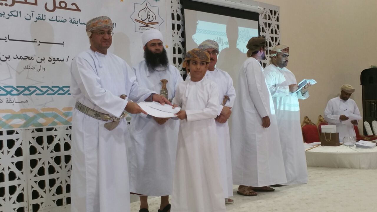 اقيم بالمركز الرياضي بولاية ضنك بمحافظة الظاهرة مساء هذا الْيَوْمَ الحفل الختامي لمسابقة ضنك للقرآن الكريم ” الدورة الثانية ” والتي أقيمت بإشراف الجمعية العمانية للعناية بالقرآن الكريم ، رعى الاحتفال سعادة الشيخ سعود بن محمد الهنائي والي ضنك . إشتمل برنامج الاحتفال على تقديم نماذج لتلاوات من القرآن الكريم لمجموعة من المتسابقين ، تلا ذلك تقديم عرض مرئي عّن أهداف وأهمية المسابقة في غرس قيم القرآن الكريم في قلوب وعقول الناشئة . بعدها شارك أسعد بن ساعد اليحيائي الحاصل على المركز الاول في مسابقة شباب بهلاء للقرآن الكريم في مجال الخطابة بتقديم مشاركة من مختارات متنوعة في فن الخطابة .