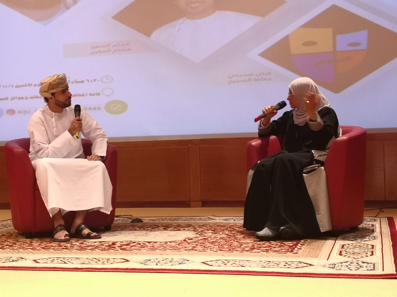 وقد تضمنت هذه الأمسية مجموعة متنوعة من الفقرات بتقديم المذيع المتألق “محمد نصر”، حيث بدأت فقراتها بلقاء مع الدكتورة منى السعدون (عميدة كلية الطب والعلوم الصحية بجامعة السلطان قابوس) والتي تحدثت عن مسيرتها العلمية والعملية وأهم التحديات التي واجهتها خلال ذلك، بعدها قدم الشاعر هشام الصقري قصيدة شعرية تصدح بحلو الحياة الجامعية واشعلت الحنين مع فنجان قهوة الصباح، ثم قدم المنشد مرشد البداعي فقرة انشادية أشعل بها المسرح بصوته الشجي وألحانه العذبة، وفي الختام قدمت جماعة المسرح بجامعة السلطان قابوس اسكتش مسرحي كوميدي بعنوان ” الممر” والذي حمل في طياته رسالة هادفة نحو أهمية الكفاح والمثابرة في الدراسة الجامعية.