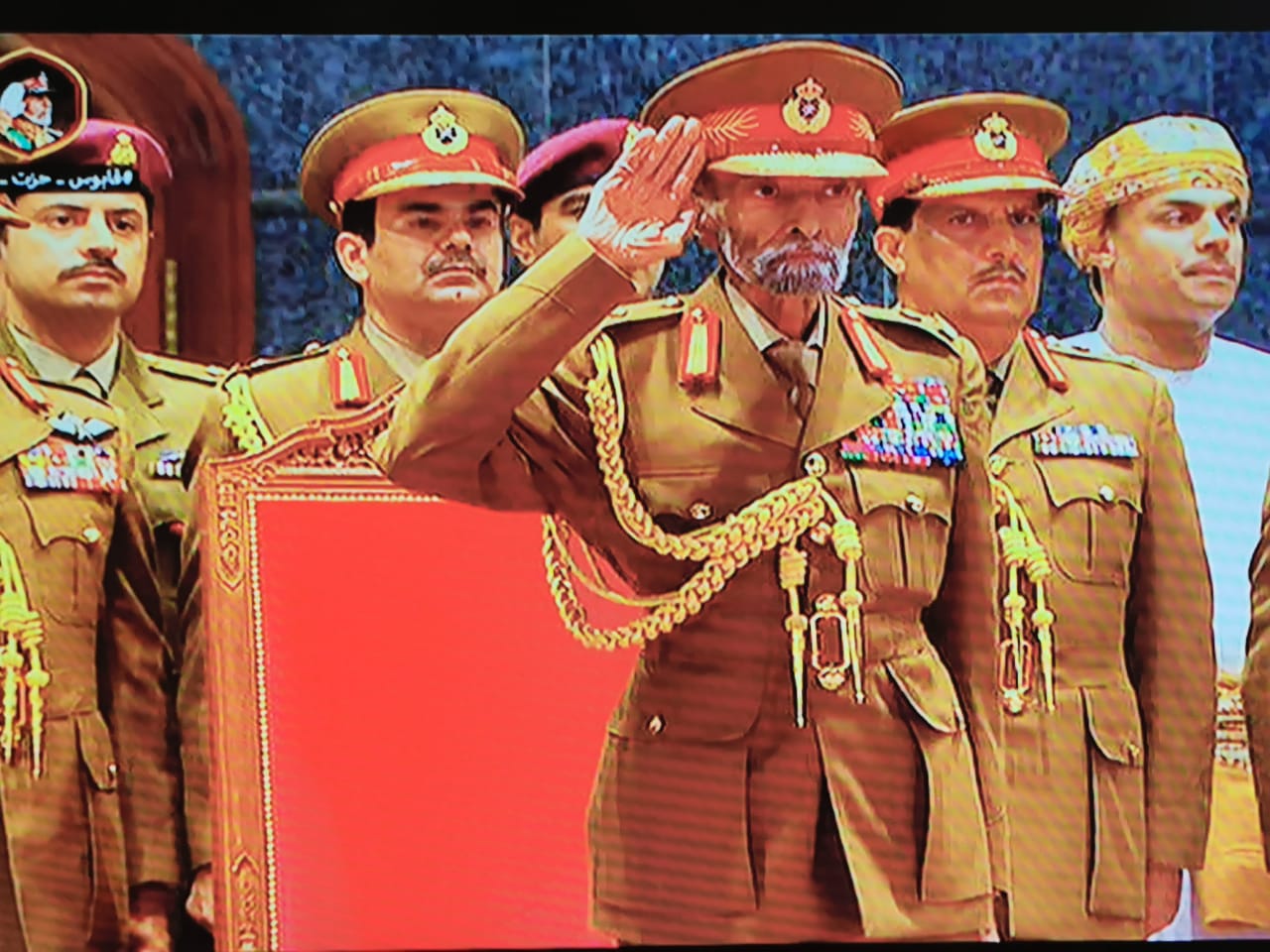 عقب ذلك تقدم قائد طابور الاستعراض العسكري إلى المقصورة السلطانية