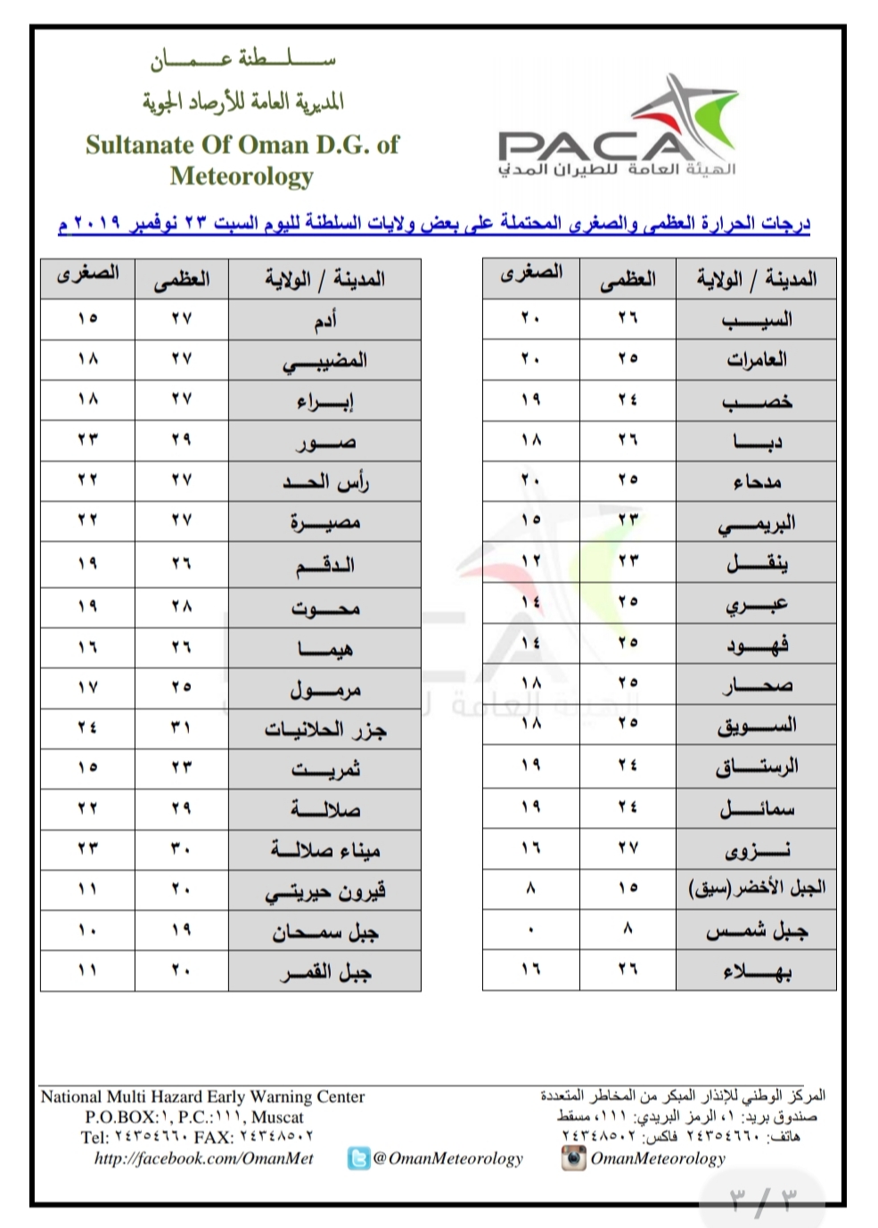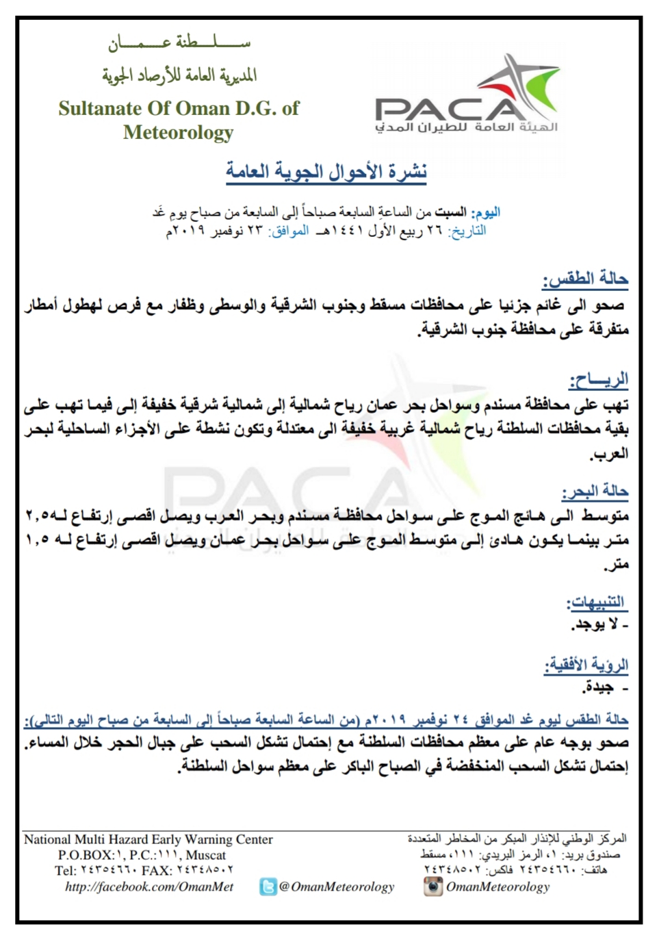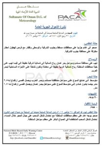 متابعينا الكرام إليكم فيما يلي نشرة الأحوال الجوية في محافظات السلطنة لهذا اليوم : السبت السادس والعشرين من ربيع الأول 1441هـ الموافق الثالث والعشرين من نوفمبر المجيد 2019م – بإذن الله تعالى .