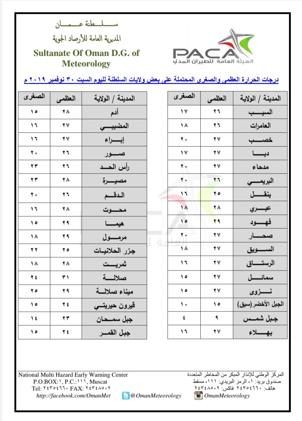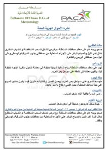 متابعينا الكرام إليكم فيما يلي نشرة الأحوال الجوية في محافظات السلطنة لهذا اليوم : السبت الثالث من ربيع الآخر 1441هـ الموافق الثلاثين من نوفمبر المجيد 2019م – بإذن الله تعالى .