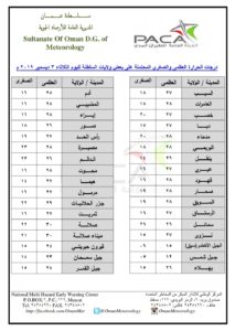 متابعينا الكرام إليكم فيما يلي نشرة الأحوال الجوية في محافظات السلطنة لهذا اليوم : الثلاثاء السادس من ربيع الآخر 1441هـ الموافق الثالث من ديسمبر 2019م – بإذن الله تعالى .