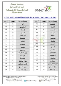 ▪︎ درجات الحرارة : من المتوقع أن تبلغ درجة الحرارة اليوم في مسقط بإذن الله – 27 العظمى ، والصغرى 21 – فيما تبلغ في صلالة : العظمى 29 والصغرى 25 ، وتصل أعلى درجات الحرارة في أغلب محافظات السلطنة بين منتصف ونهاية العشرينيات ، في حين تصل أدنى درجات الحرارة (4-) في جبل شمس .