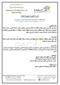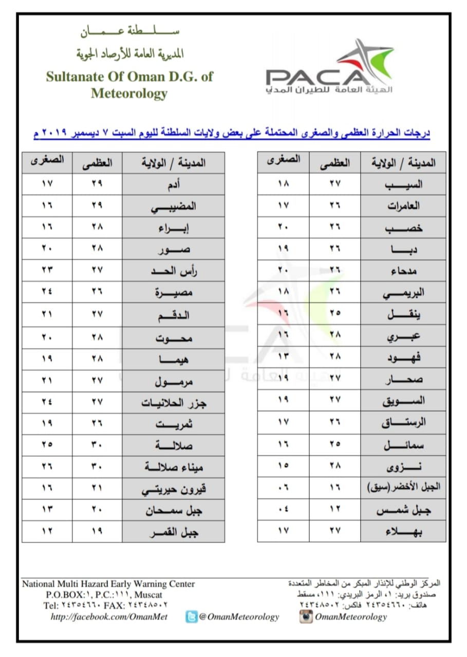 متابعينا الكرام إليكم فيما يلي نشرة الأحوال الجوية في محافظات السلطنة لهذا اليوم : السبت العاشر من ربيع الآخر 1441هـ الموافق السابع من ديسمبر 2019م – بإذن الله تعالى .