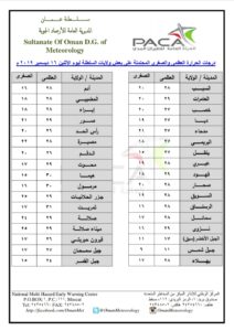 ▪︎ درجات الحرارة : من المتوقع أن تبلغ درجة الحرارة اليوم في مسقط بإذن الله – 28 العظمى ، والصغرى 20 – فيما تبلغ في صلالة : العظمى 28 والصغرى 22 ، وتصل أعلى درجات الحرارة 31 في ولاية ثمريت ، في حين تصل أدنى درجات الحرارة (6) في جبل شمس .