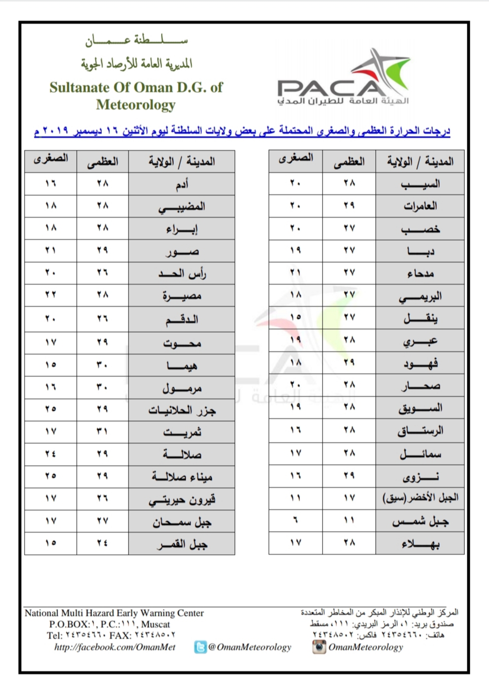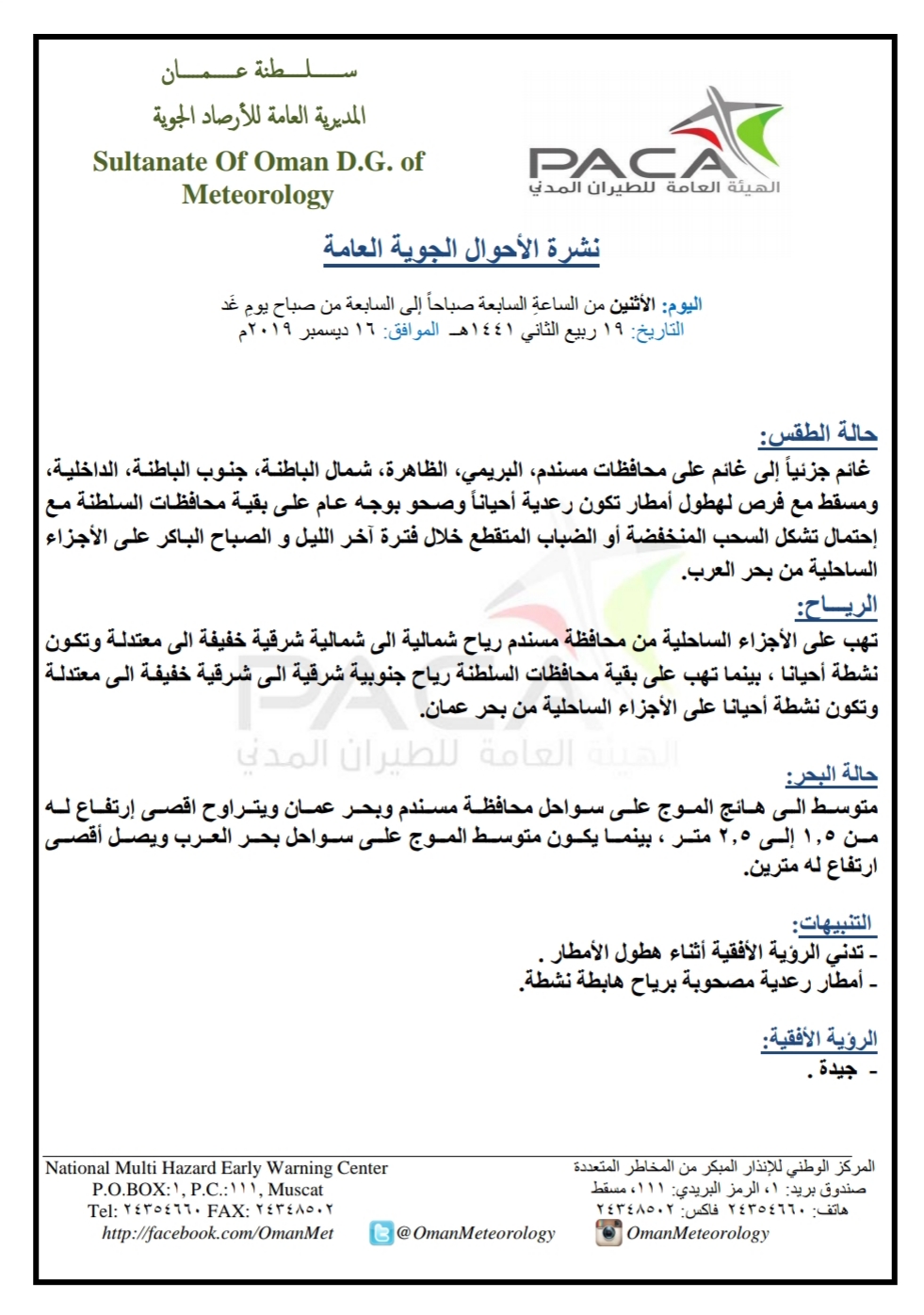 متابعينا الكرام إليكم فيما يلي نشرة الأحوال الجوية في محافظات السلطنة لهذا اليوم : الإثنين التاسع عشر من ربيع الآخر 1441هـ الموافق السادس عشر من ديسمبر 2019م – بإذن الله تعالى .