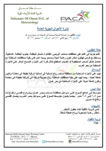 ▪︎ حالة الطقس : غائم جزئياً إلى غائم على محافظات مسندم ، البريمي ، الظاهرة ، شمال الباطنة ، جنوب الباطنة ، الداخلية ، ومسقط مع فرص لهطول أمطار تكون رعدية أحياناً ، وصحو بوجه عام على بقية محافظات السلطنة مع إحتمال تشكل السحب المنخفضة أو الضباب المتقطع خلال فترة آخر الليل والصباح الباكر على الأجزاء الساحلية من بحر العرب .