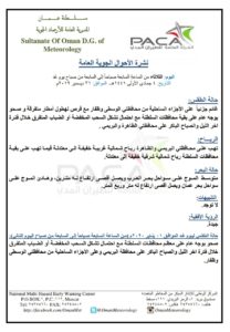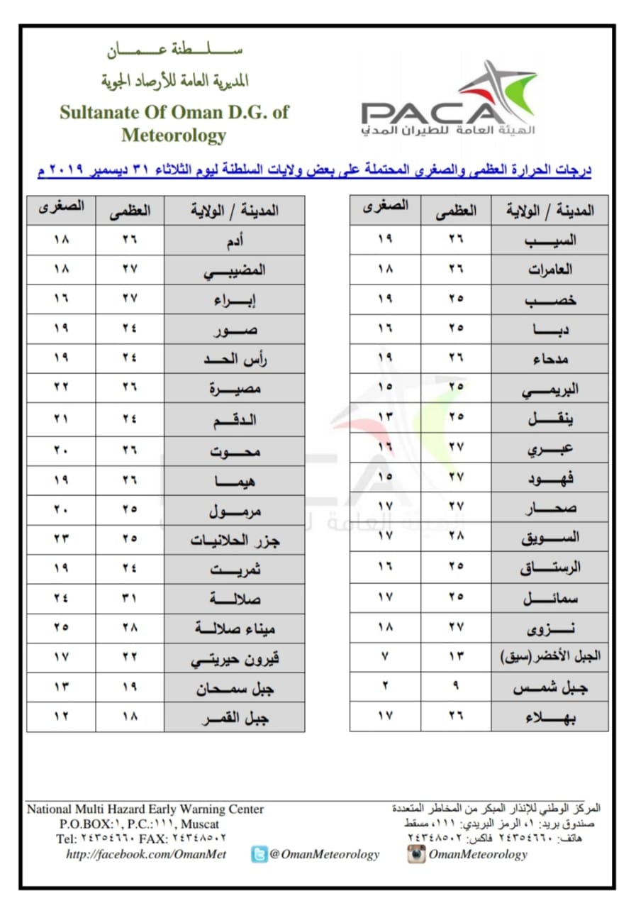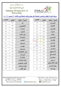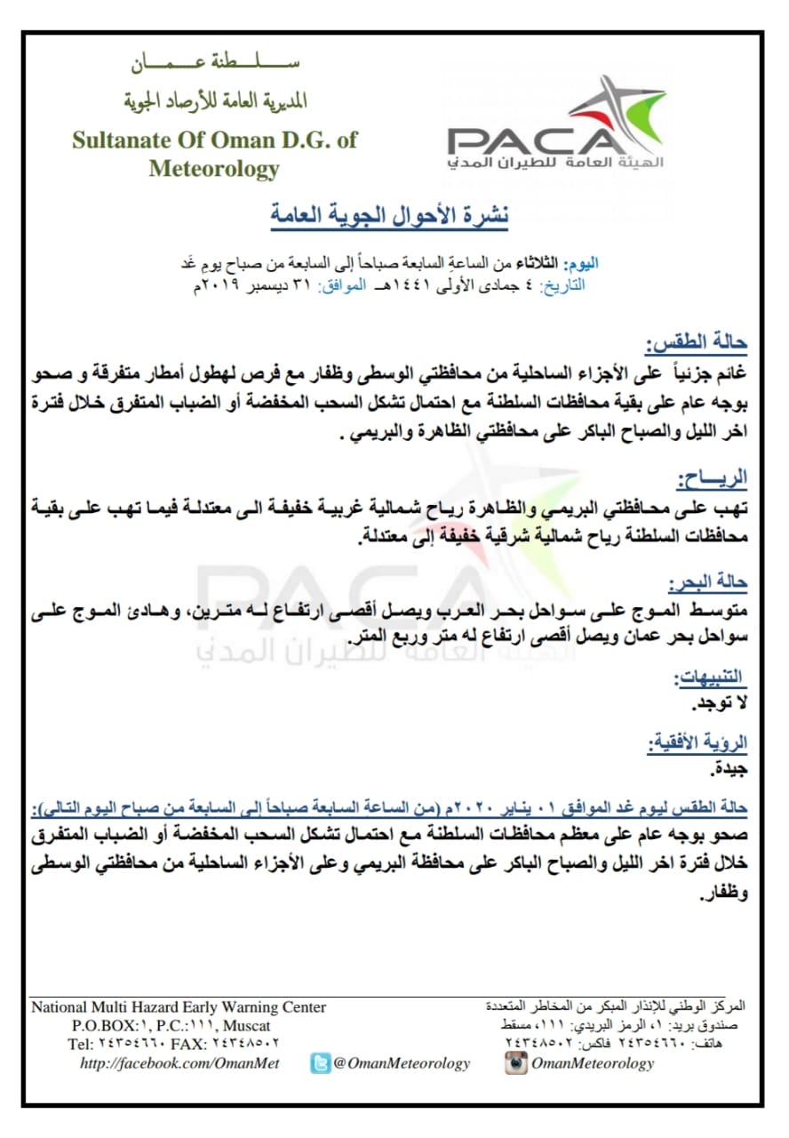 متابعينا الكرام إليكم فيما يلي نشرة الأحوال الجوية في محافظات السلطنة لهذا اليوم : الثلاثاء الرابع من جمادى الأولى 1441هـ الموافق الحادي والثلاثين من ديسمبر 2019م – بإذن الله تعالى .