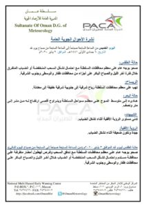 متابعينا الكرام إليكم فيما يلي نشرة الأحوال الجوية في محافظات السلطنة لهذا اليوم : الخميس السادس من جمادى الأولى 1441هـ الموافق الثاني من يناير 2020 – بإذن الله تعالى .