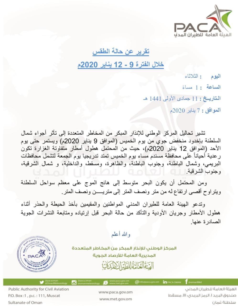 ▪︎ تشير تحاليل المركز الوطني للإنذار المبكر من المخاطر المتعددة إلى تأثر أجواء شمال السلطنة بإخدود منخفض جوي من يوم الخميس الموافق 9 يناير 2020م ويستمر حتى يوم الأحد الموافق 12 يناير 2020 م ، حيث من المحتمل هطول أمطار متفاوتة الغزارة تكون رعدية أحياناً على محافظة مسندم مساء يوم الخميس تمتد تدريجيا إلى يوم الجمعة لتشمل محافظات البريمي ، وشمال الباطنة ، وجنوب الباطنة ، والظاهرة ، ومسقط والداخلية ، وشمال الشرقية ، وجنوب الشرقية ومن المحتمل أن يكون البحر متوسط إلى هائج الموج على معظم سواحل السلطنة ويتراوح أقصى ارتفاع له من متر ونصف المتر إلى مترين ونصف المتر ، وتدعو الهيئة العامة للطيران المدني المواطنين والمقيمين بأخذ الحيطة والحذر أثناء هطول الأمطار وجريان الأودية والتأكد من حالة البحر قبل إرتياده ومتابعة النشرات الجوية الصادرة عنها .