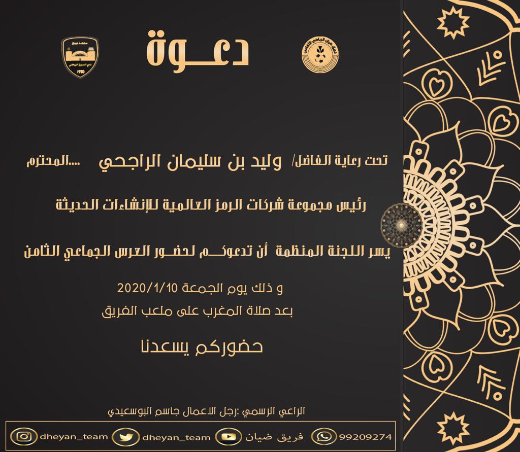 يقيم فريق ضيان الرياضي الثقافي الاجتماعي التابع لنادي السويق حفل زفاف ١٨ عريساً العرس الجماعي التاسع لعام ٢٠٢٠ وذلك تحت رعاية الفاضل _ وليد بن سليمان الراجحي _ رئيس مجموعة شركات الرمز العالمية الانشاءات الحديثة والذي سيقام بملعب فريق ضيان الرياضي التابع لنادي السويق، بتنظيم متواصل من أهالي منطقة ضيان بالولاية وبدعم جهات أهليه ومتبرعين من أبناء الولاية والقطاع الخاص.