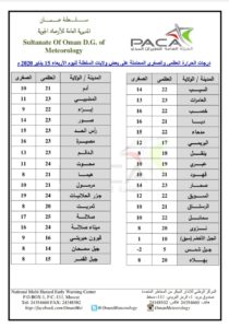 ▪︎ درجات الحرارة : من المتوقع أن تبلغ درجة الحرارة اليوم في مسقط بإذن الله – 18 العظمى ، والصغرى 14 – فيما تبلغ في صلالة : العظمى 25 والصغرى 18 ، بينما تتراوح درجات الحرارة العظمى في بقية محافظات السلطنة مابين بداية ومنتصف العشرينيات ، في حين تصل أدنى درجات الحرارة ( 2_ ) في جبل شمس .