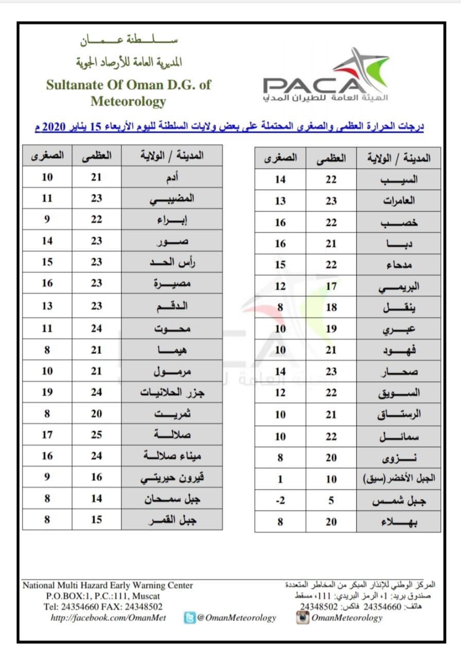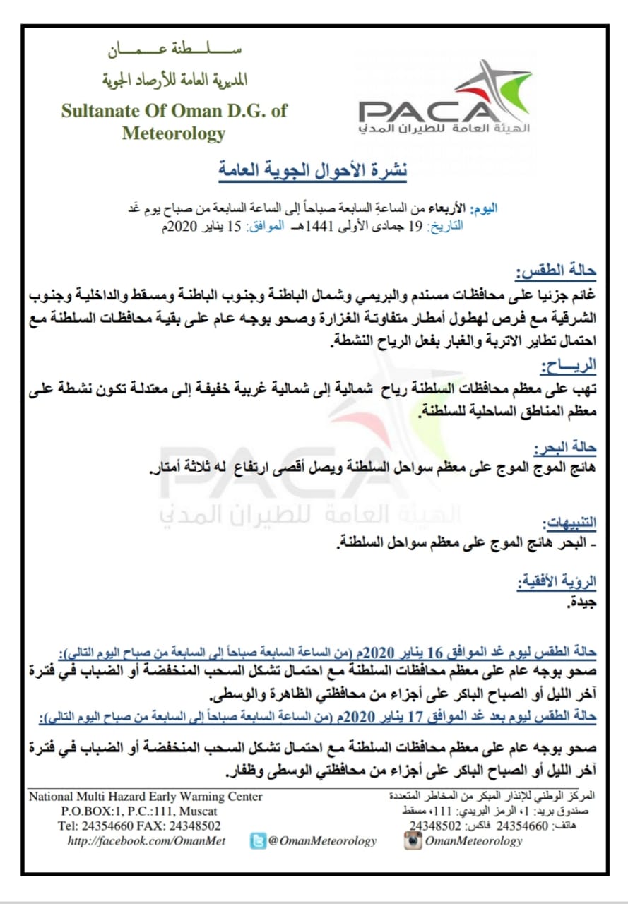 متابعينا الكرام إليكم فيما يلي نشرة الأحوال الجوية في محافظات السلطنة لهذا اليوم : الأربعاء التاسع عشر من جمادى الأولى 1441هـ الموافق الخامس عشر من يناير 2020 – بإذن الله تعالى .