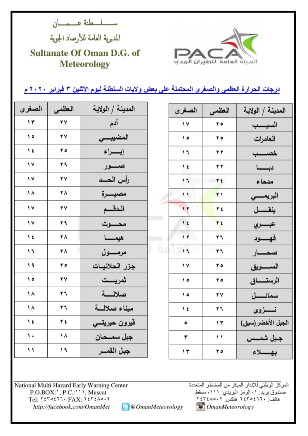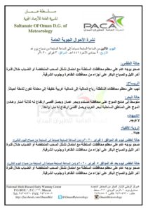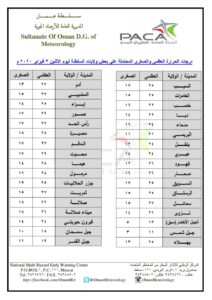 متابعينا الكرام إليكم فيما يلي نشرة الأحوال الجوية في محافظات السلطنة لهذا اليوم : الإثنين التاسع من جمادى الثانية 1441هـ الموافق الثالث من فبراير 2020 – بإذن الله تعالى .
