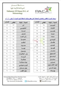 متابعينا الكرام إليكم فيما يلي نشرة الأحوال الجوية في محافظات السلطنة لهذا اليوم : السبت التاسع والعشرون من جمادى الأولى 1441هـ الموافق الخامس والعشرين من يناير 2020 – بإذن الله تعالى .