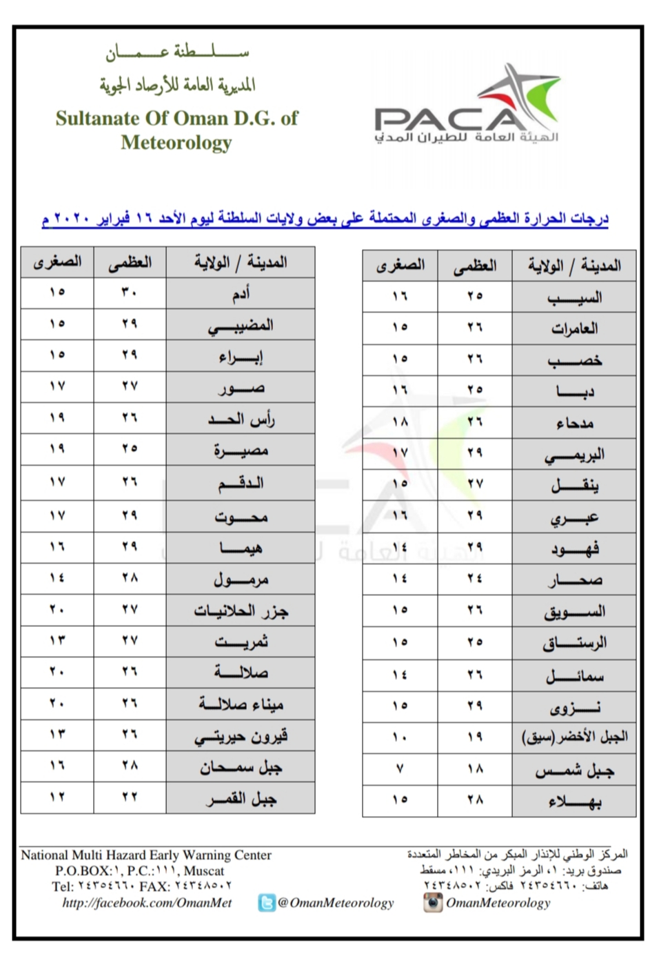 متابعينا الكرام إليكم فيما يلي نشرة الأحوال الجوية في محافظات السلطنة لهذا اليوم : الأحد الثاني والعشرين من جمادى الثانية 1441هـ الموافق السادس عشر من فبراير 2020 – بإذن الله تعالى .
