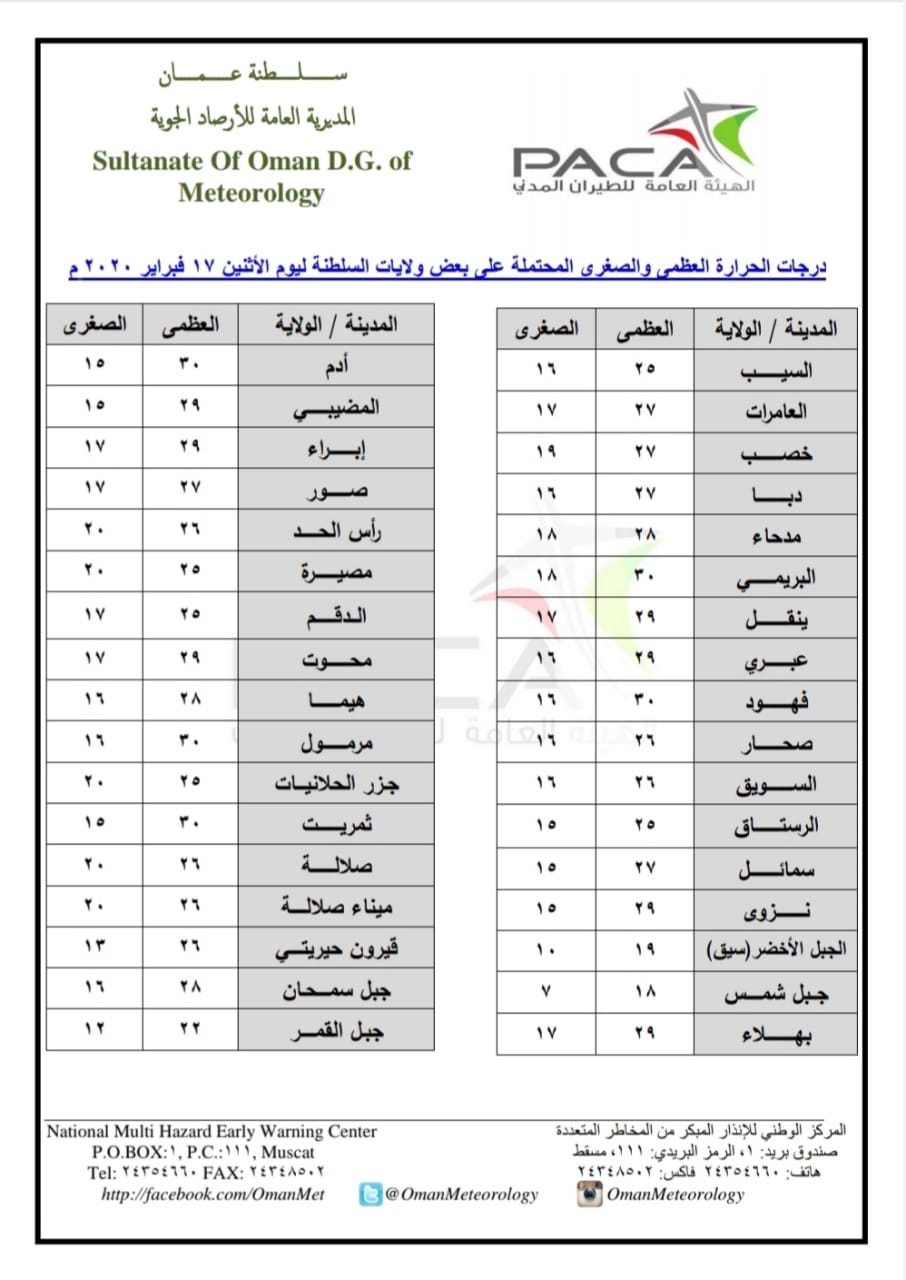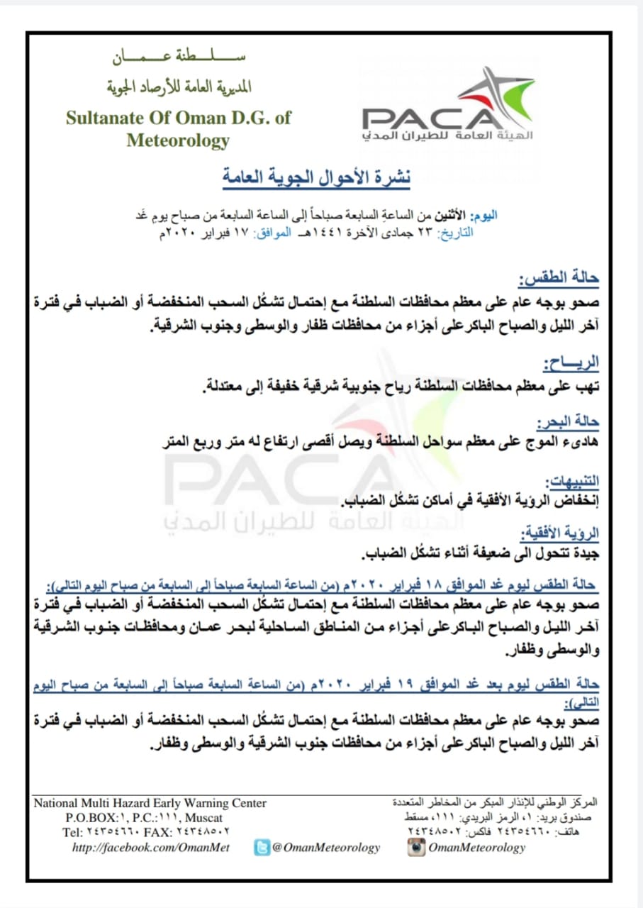 متابعينا الكرام إليكم فيما يلي نشرة الأحوال الجوية في محافظات السلطنة لهذا اليوم : الإثنين الثالث والعشرين من جمادى الثانية 1441هـ الموافق السابع عشر من فبراير 2020 – بإذن الله تعالى .