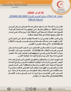 أعلنت وزارة الصحة عن تسجيل حالتي إصابة جديدتين بمرض فيروس كورونا 2019 مرتبطتين بالسفر إلى الجمهورية الاسلامية الإيرانية، لتصبح عدد الحالات المسجلة في السلطنة (4) أربع حالات حتى إصدار هذا البيان وجميع الحالات في حالة صحية مستقرة.