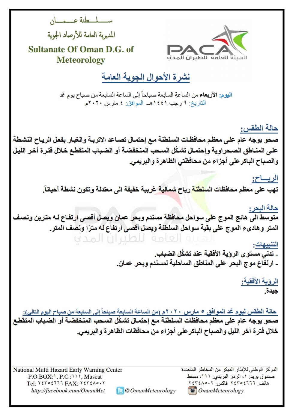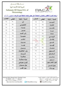 متابعينا الكرام إليكم فيما يلي نشرة الأحوال الجوية في محافظات السلطنة لهذا اليوم : الأربعاء التاسع من رجب 1441هـ الموافق الرابع من مارس 2020 – بإذن الله تعالى .
